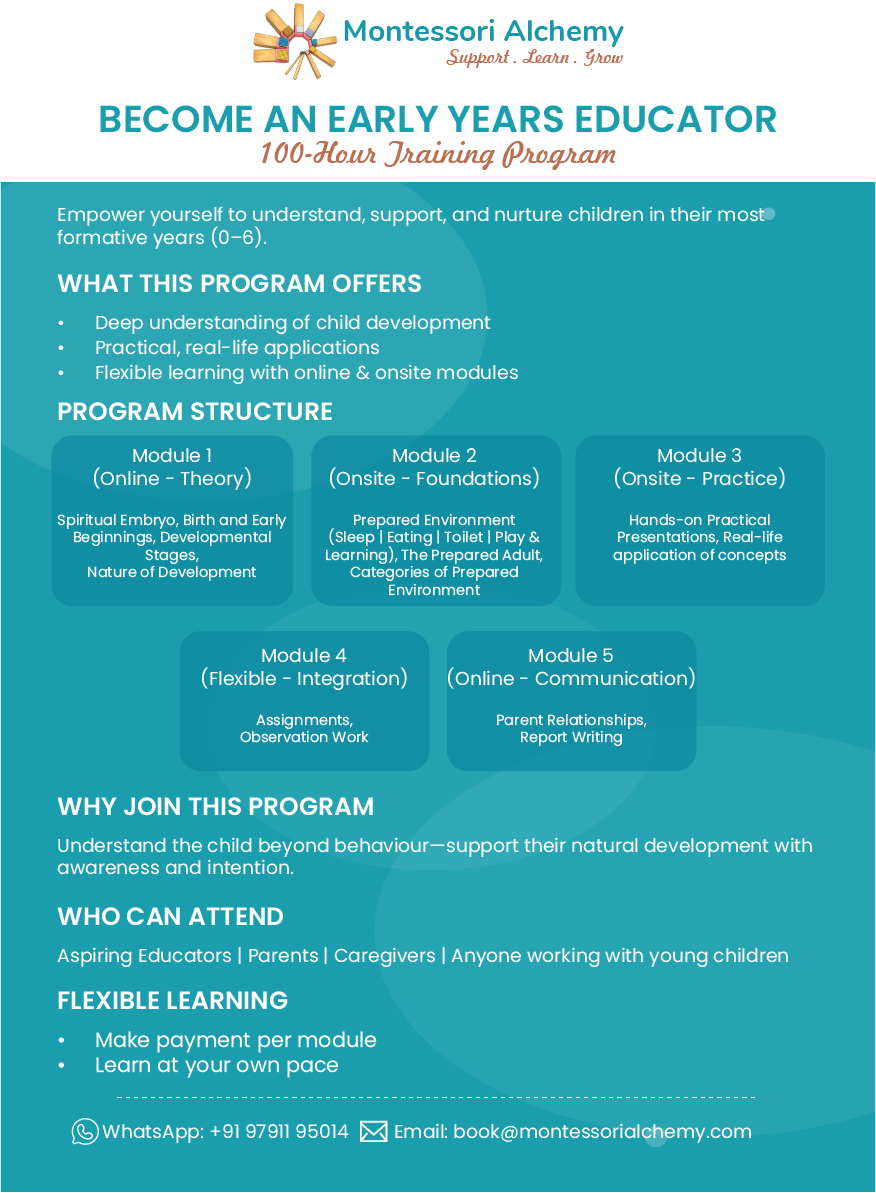 Preparing Montessori Environments, Positive discipline and implementing tools of positive discipline, The Montessori method, Toddler teacher training program.
